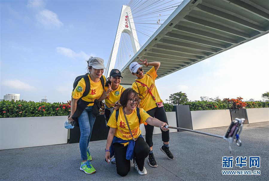 10月31日,参加健步走的群众在海口地标——世纪大桥下合影。 当日,2020海南万人健步大会在海口举行,逾万名群众参与其中。 新华社记者 蒲晓旭 摄