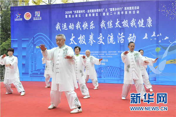 新华网贵阳11月2日电(周远钢)11月2日,以“我运动我快乐,我练太极我健康”为主题的太极拳交流活动在贵阳市观山湖区金华镇举行,本场活动是2020年“共享新时代全民健身贵阳行”之“富美乡村行”系列惠民活动的其中一场。白云区代表队、世纪城街道一队、金阳街道代表队、百花湖代表队等10支队伍参加活动,通过表演太极拳,一起交流技艺,愉悦身心。