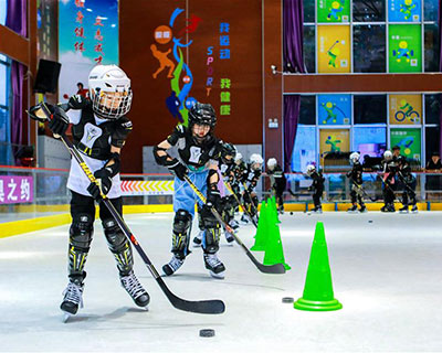 8月5日,河北省邯郸市邯山区美的小学冰球队队员在进行对抗比赛。