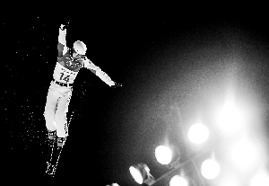 竞技赛场,自由式滑雪空中技巧运动员与光共舞。