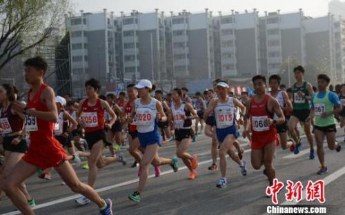 资料图:2018年徐州国际马拉松国内外20000余名选手出发。 朱志庚 摄