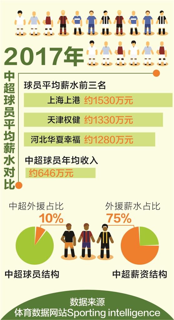 虽然近年来中超俱乐部的收入逐渐增长,但各家俱乐部仍处于严重的亏损状态,广州恒大淘宝足球俱乐部2017年亏损9.87亿元,上海上港仅2017年上半年就亏损5.73亿元……俱乐部亏损的主要原因是球员薪酬太高。2017年11月,体育数据网站Sporting intelligence发布了2017年度世界各大体育联盟薪资排行榜,中超以5.032亿美元(约32亿元人民币)的总薪资排名第11位。如此算来,中超16支球队总计495名球员,年平均收入约646万元人民币。薪资平均值前三名球队分别是上海上港(约1530万元)、天津权健(约1330万元)、河北华夏幸福(约1280万元)。占中超球员数量10%的外援薪水总额,超过中超总薪水的75%。俱乐部收入连年上涨,但亏损却越来越严重。