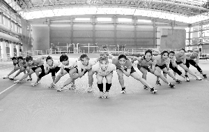 2017年6月,北京38度的高温没有阻拦住中国速滑队中长距离组队员们进行大强度训练。图为女队员摆出造型拍合影。 本报记者 王宪民摄