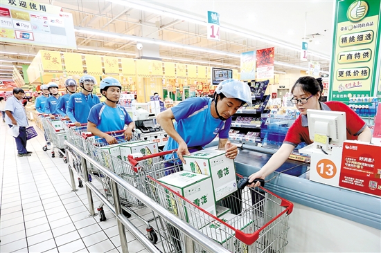 6月17日晚7点,世界杯哥斯达黎加对塞尔维亚开打前,上海普陀区某商场内的轰趴馆里,啤酒禁不住狂欢的消耗,20多名球迷因啤酒告急而紧急预订300瓶啤酒。25箱啤酒明显不是一个人就能通过手拎肩抬的事,在接到订单后,外卖小哥吴应兵喊上了其他5名小哥,一起去大润发曹安店搬货。半个小时后,300瓶啤酒到达轰趴馆。5名小哥成为这些客户的英雄,推开门的一瞬间,集体掌声成为他们当晚最深的回忆。