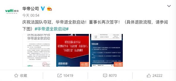 今天凌晨,法国队一举夺冠,华帝随后就其官网微信号里表示,“庆祝法国队夺冠,华帝退全款启动。”并公布线上电商和线下门店的具体退全款流程、审核要求,以及特别提醒事项等。消费者退款登记日期截止到7月24日。