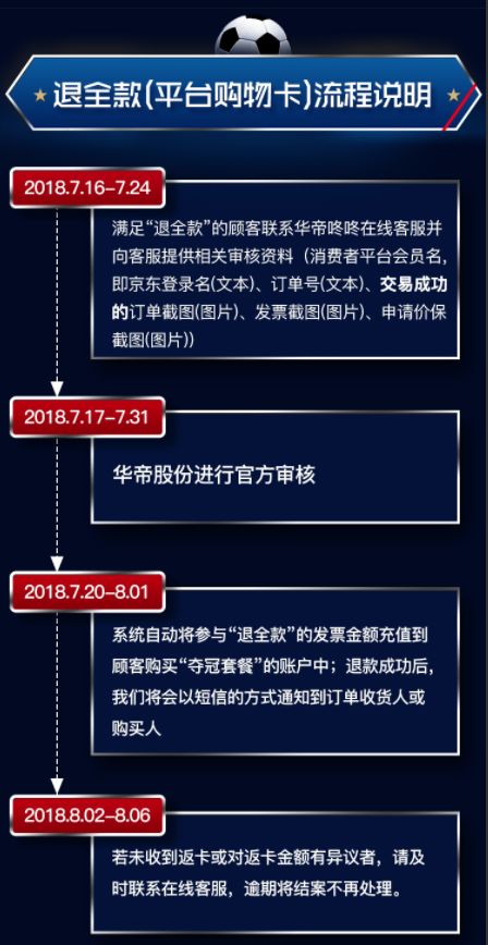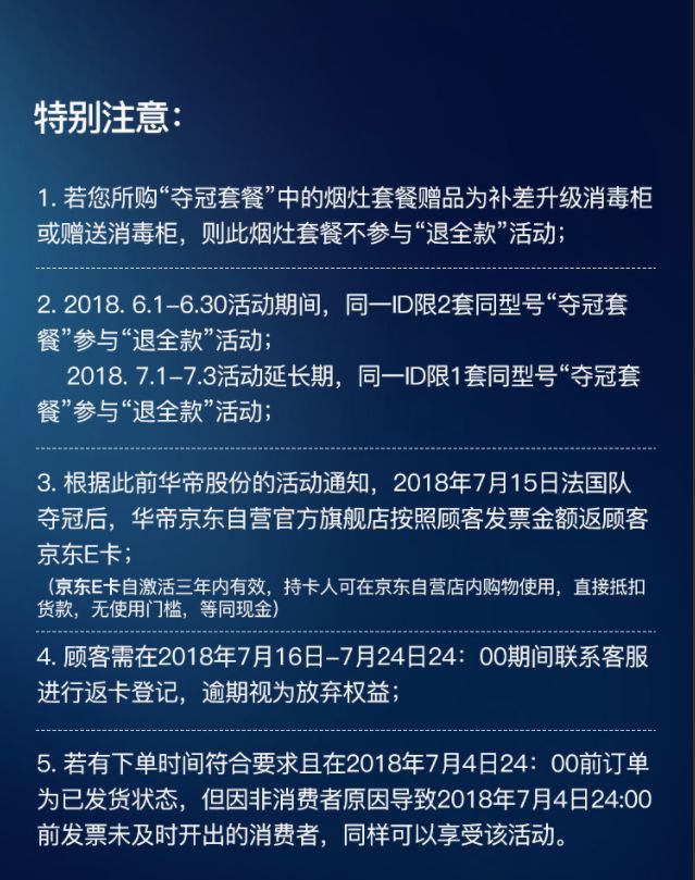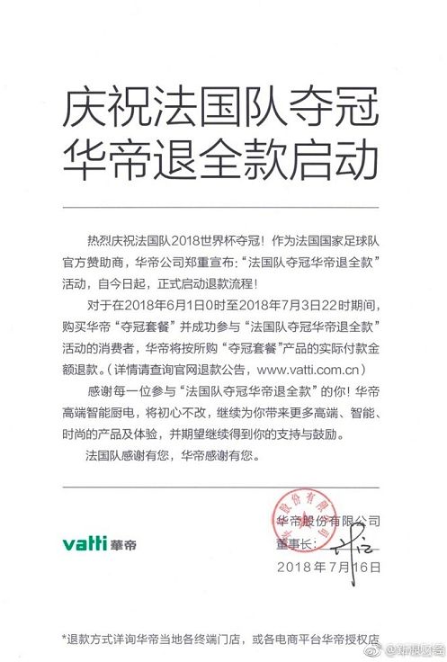 按公司的说法,世界杯前夕,为了支持法国队并迎接618,华帝在报纸上刊发了公司所作的决定:若法国国家足球队在2018年俄罗斯世界杯夺冠,则对于在2018年6月1日0时至2018年6月30日22时(后延长至7月3日22时)期间,凡购买华帝“夺冠套餐”的消费者,华帝将按所购“夺冠套餐”产品的发票金额退款。