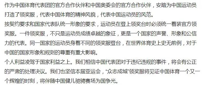 20日下午,安踏在官方微博上发图,配文:“一件领奖服不止于成绩,更是国家荣誉,是国家形象,规则和底线不容辱没”,“同一个梦想,同一个使命,统一的领奖服”。