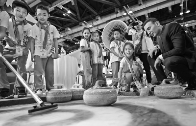 昨天,在2018国际冬季运动博览会现场,小朋友们一同参与冰壶运动体验活动,感受冬奥体育项目的独特魅力。本报记者 饶强摄