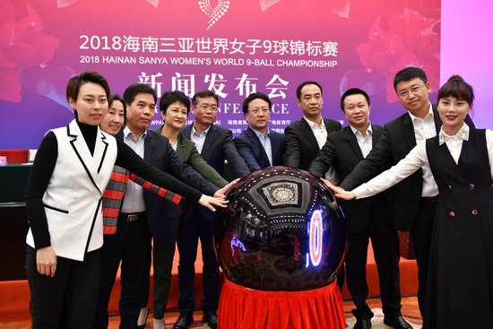 最后,出席发布会的领导、嘉宾及球员在与会人员的注目下,按下启动球,宣告2018海南三亚世界女子9球锦标赛正式启动。
