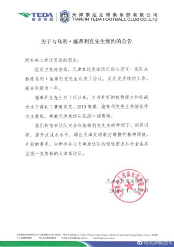 “施蒂利克先生自上任以来,自身良好的执教能力和技战术水平得到了普遍肯定。2019赛季,施蒂利克先生将继续作为主教练,执教天津泰达征战中超赛场。”