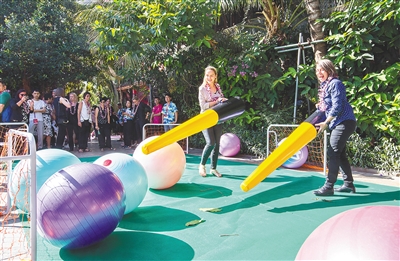 参加世界女子9球锦标赛的选手在开幕式上体验趣味9球游戏。 本报记者 武威 摄