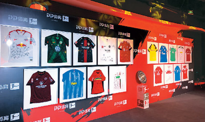 活动现场展示的德甲球队球衣。本报记者 刘 峣摄