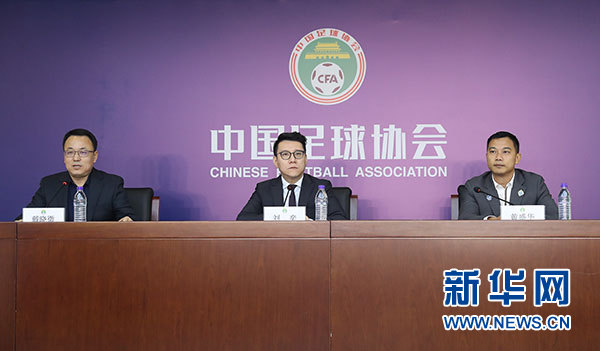 10月16日,中国足协秘书长刘奕(中)、职业联盟筹备组召集人黄盛华(右)、中国足协执委戴晓微在发布会上。 当日,中国足协在北京召开新闻发布会,介绍职业联盟筹备情况。 新华社记者曹灿摄