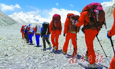 “觇标必须由人带上峰顶,有了它,我们在山脚下布设的观测点,就能更精确地照准峰顶的测量目标,从而测得精确的角度和距离。”张庆涛说,珠峰峰顶并不是一个点,而是一个20多平方米的平面,从山脚下的各观测点瞄准峰顶测量,目标点难以一致,觇标的使用解决了这一问题。