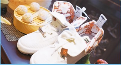 上海豫园南翔馒头店携手大孚飞跃发布跨界潮鞋,将小笼包图案印在鞋上。