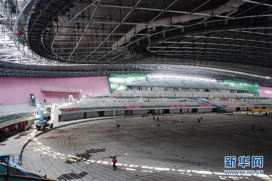 7月22日,工人在国家速滑馆内施工。新华社记者张晨霖摄