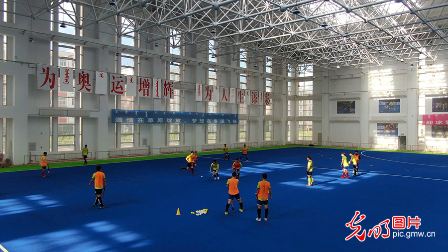 自基地建成以来,先后接待江苏女曲、上海女曲、广东男曲、北京男曲、甘肃男曲以及国家男曲等多支国内队伍夏训,也吸引了韩国城南俱乐部队、印度尼西亚国家男女队来此训练。图为2020年8月4日,无人机航拍莫旗曲棍球队在莫旗曲棍球训练基地训练。(李刚摄/光明图片)