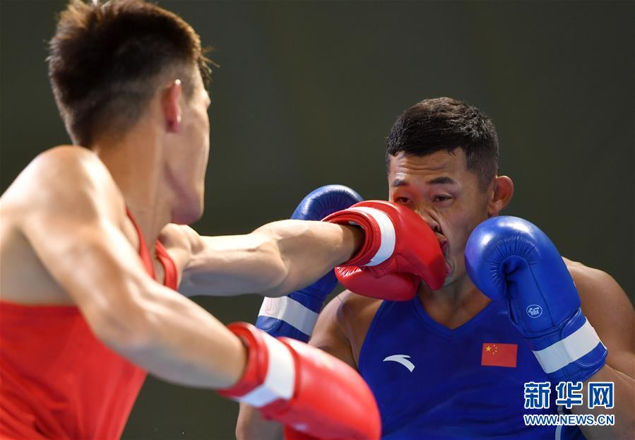 9月21日,内蒙古队选手张继磊(右)与江苏队选手陈大祥在81公斤级半决赛中。 当日,在河南省洛阳市宜阳县举行的2020年全国男子拳击锦标赛81公斤级半决赛中,江苏队选手陈大祥以5比0击败内蒙古队选手张继磊,晋级决赛。 新华社记者李嘉南摄