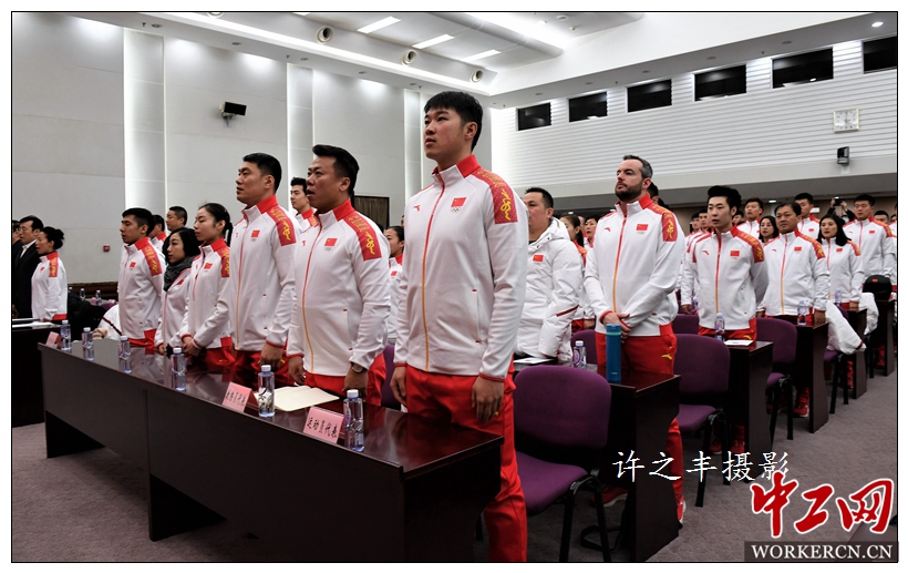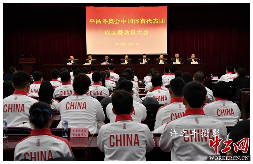 2018年1月31日,平昌冬奥会中国体育代表团在北京正式成立,本届冬奥会中国体育代表团共获得82个参赛资格,将参加5个大项、12个分项、55个小项比赛,这是获得参赛项目最多的一次冬奥会,其中单板滑雪平行大回转、跳台滑雪、雪车等都是首次获得奥运会参赛资格。国家体育总局局长苟仲文担任平昌冬奥会中国体育代表团团长。图为平昌冬奥会中国代表团成立大会现场。工人日报-中工网记者许之丰摄影报道