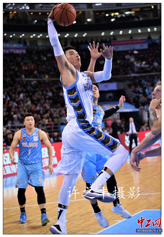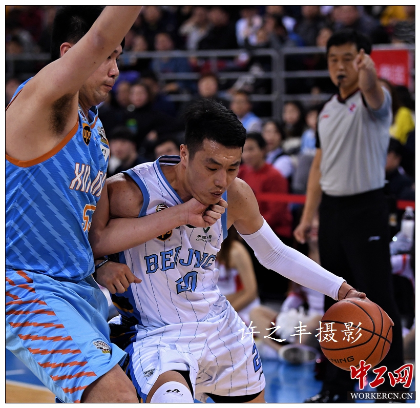 2018年2月6日晚,CBA联赛第36轮比赛,单外援作战的北京首钢主场以111比95战胜新疆队。北京首钢排名上升到第七位。图为双方比赛的拼抢。工人日报-中工网记者许之丰摄影报道