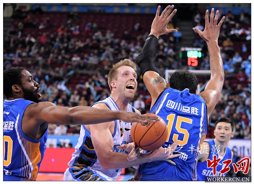 2018年2月4日晚,北京五棵松体育馆,CBA联赛第35轮比赛,北京首钢队主场以111比97战胜四川队。第35轮结束之后,北京首钢队提前3轮拿到了季后赛资格,而北京北控队退出季后赛的争夺。工人日报-中工网记者许之丰摄影报道