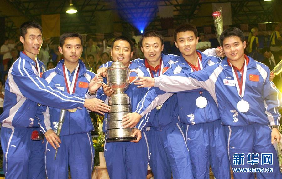 图为2004年3月7日,在卡塔尔多哈举行的第47届世界乒乓球锦标赛男子团体赛决赛中,中国队以3比0击败德国队,捧得斯韦思林杯。新华社记者迟海峰摄