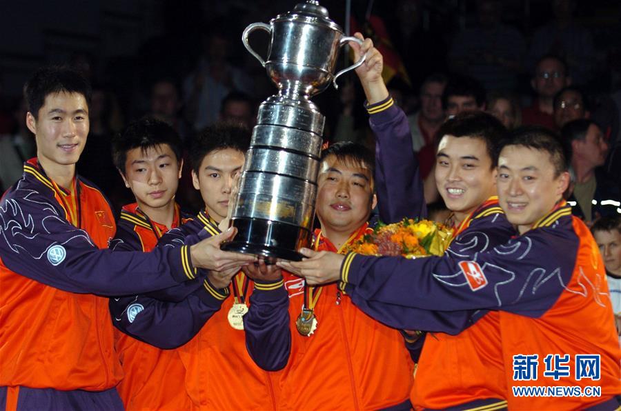 图为2006年5月1日,在德国不来梅举行的第48届世乒赛男子团体决赛中,中国队以3比0战胜韩国队,捧得斯韦思林杯。 新华社记者吴晓凌摄