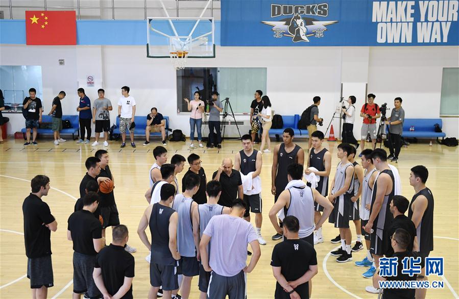 ↑7月25日,北京首钢男篮主教练雅尼斯(中)进行训练后总结。新华社记者张晨霖摄