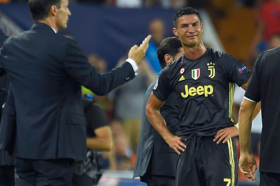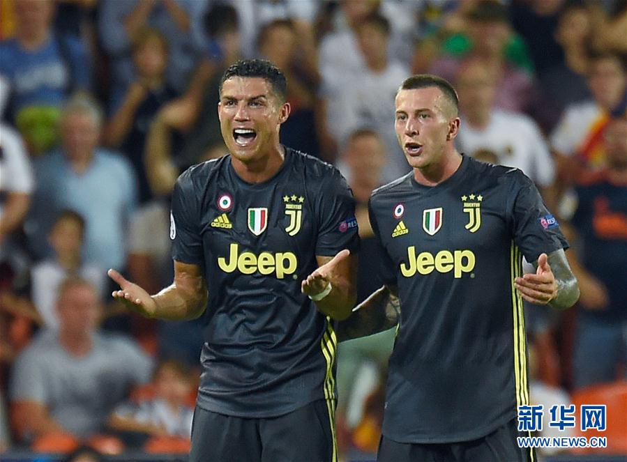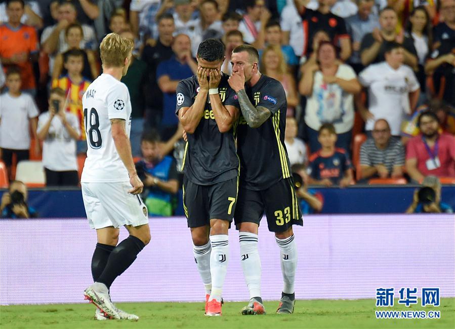 9月19日,尤文图斯队球员克·罗纳尔多(中)被主裁判红牌罚下。 当日,在2018-2019赛季欧洲足球冠军联赛H组的一场比赛中,意甲尤文图斯队客场以2比0战胜西甲巴伦西亚队。 新华社/法新