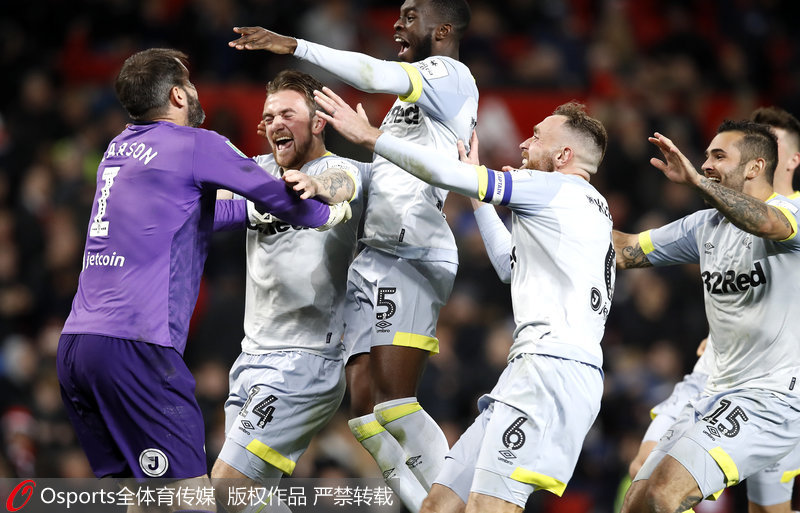进入点球大战。首轮,蒙特爆射左上角入网,卢卡库低射右下角得分,1-1;次轮,约泽佐恩和阿什利-扬先后打入上角,2-2;第3轮,威尔逊和费莱尼也双双命中,3-3;第4轮,马里奥特低射左下角,弗雷德射入右上角,4-4;第5轮,布拉德利-约翰逊和马夏尔各自罚入,5-5;第6轮,布赖森和达洛特也先后射入,6-6;第7轮,福赛思和马蒂奇同样命中,7-7;第8轮,德比郡基奥射入,菲尔-琼斯主罚被扑出,8-7。兰帕德率领德比郡淘汰曼联晋级。