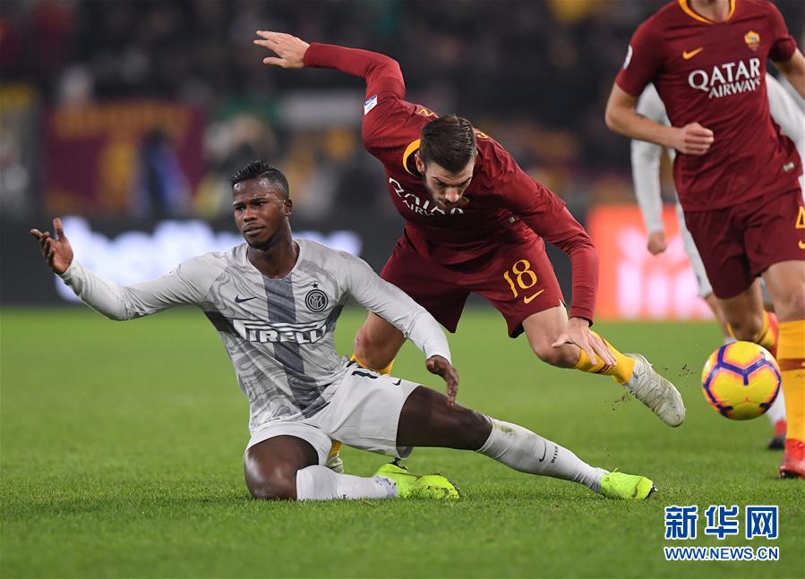 12月2日,国际米兰队球员凯塔·巴尔德(左) 在比赛中与罗马队球员桑顿拼抢 当日,在2018-2019赛季意大利足球甲级联赛第14轮比赛中,罗马队主场以2比2战平国际米兰队。 新华社发(阿尔贝托·林格里亚摄)