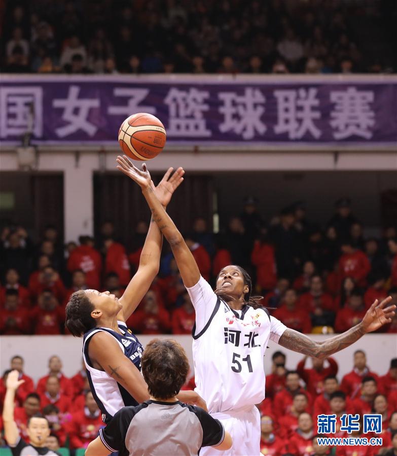 12月3日,河北英励队球员杰西卡·布兰雷(右)和福建心相印队球员爱丽莎·芮内·德沃妮(左)在比赛中拼抢。 当日,在2018-2019赛季中国女子篮球联赛(WCBA)第17轮比赛中,河北英励队主场以85比52战胜福建心相印队。 新华社记者朱旭东摄