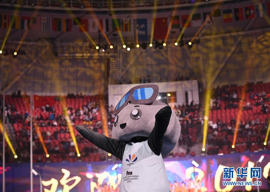 12月16日,杭州短池世锦赛吉祥物奇力在闭幕式上。 当日,2018国际泳联短池游泳世界锦标赛在浙江杭州落下帷幕。 新华社记者翁忻旸摄