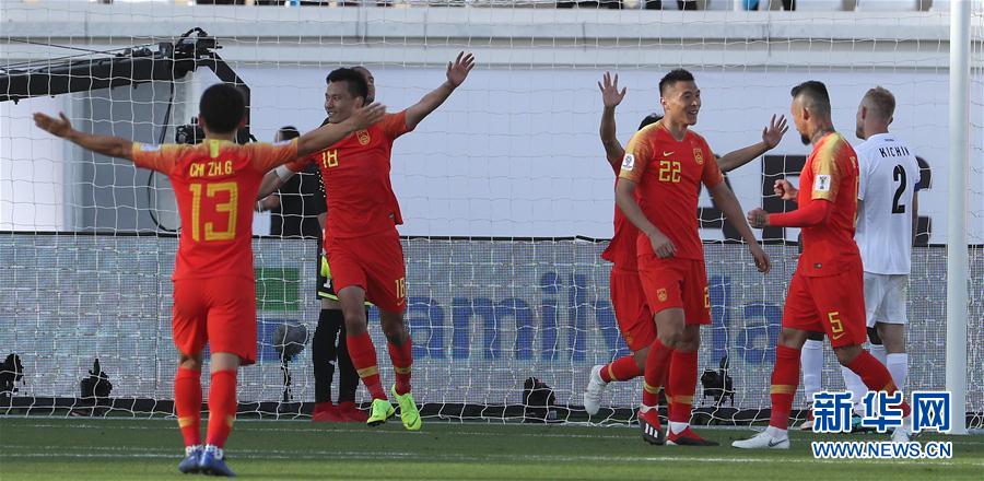 1月7日,中国队球员在比赛中庆祝首粒进球。 当日,在阿联酋艾因举行的2019年亚洲杯足球赛C组小组赛中,中国队以2比1战胜吉尔吉斯斯坦队。 新华社记者李钢摄