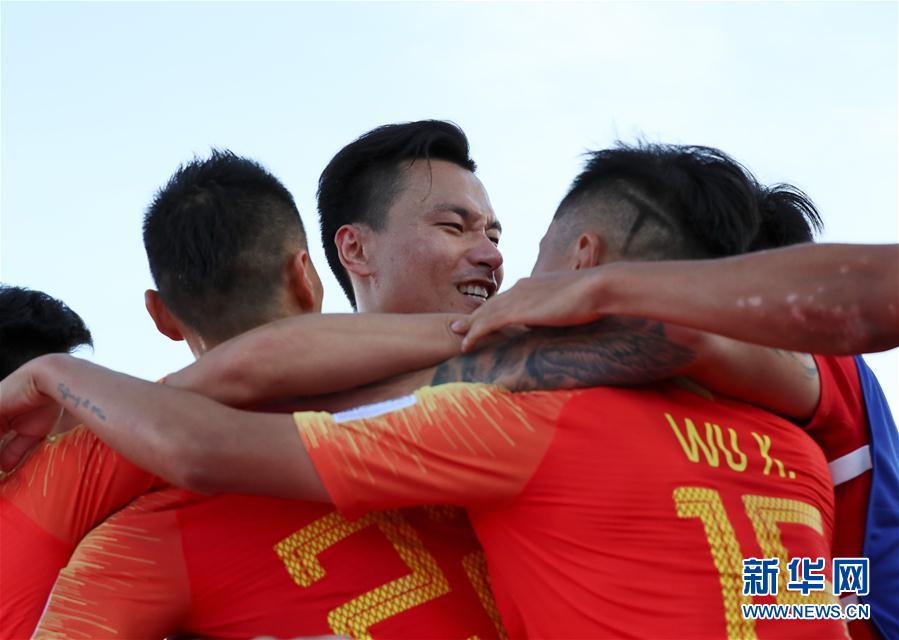 1月7日,中国队球员在比赛中庆祝进球。 当日,在阿联酋艾因举行的2019年亚洲杯足球赛C组小组赛中,中国队以2比1战胜吉尔吉斯斯坦队。 新华社记者曹灿摄