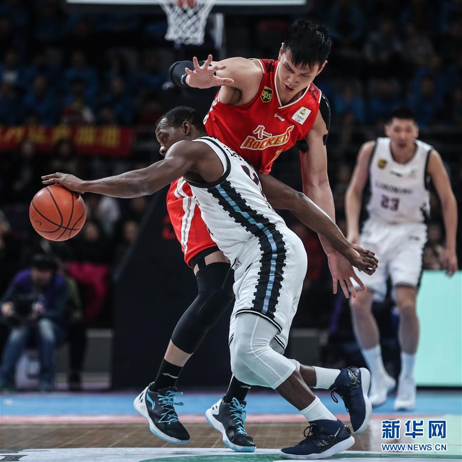 辽宁本钢队球员哈德森(前)在比赛中带球突破。新华社记者潘昱龙摄