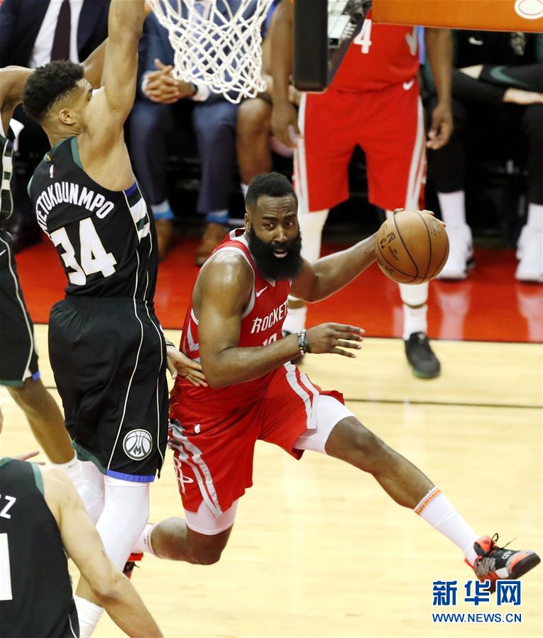 1月9日,火箭队球员哈登(右)在比赛中突破。 当日,在2018-2019赛季NBA常规赛中,休斯敦火箭队主场以109比116不敌密尔沃基雄鹿队。 新华社发(宋穹摄)