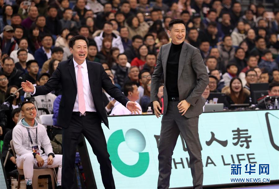 ↑1月13日,南方明星队主教练杜锋(右)和助理教练李春江在比赛中。 当日,在山东青岛举行的2019年CBA全明星周末全明星赛中,南方明星队以160比145战胜北方明星队。 新华社记者孟永民摄