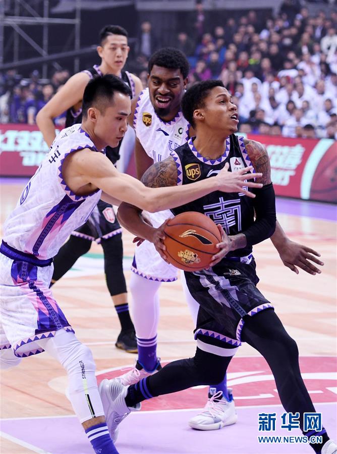 ↑1月13日,南方明星队球员约瑟夫·杨(右一)在比赛中带球突破。 当日,在山东青岛举行的2019年CBA全明星周末全明星赛中,南方明星队以160比145战胜北方明星队。 新华社记者李紫恒摄