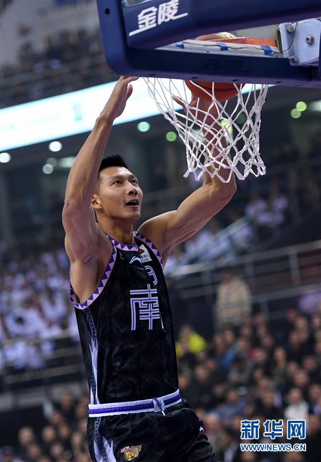 ↑1月13日,南方明星队球员易建联在比赛中扣篮。 当日,在山东青岛举行的2019年CBA全明星周末全明星赛中,南方明星队以160比145战胜北方明星队。 新华社记者李紫恒摄