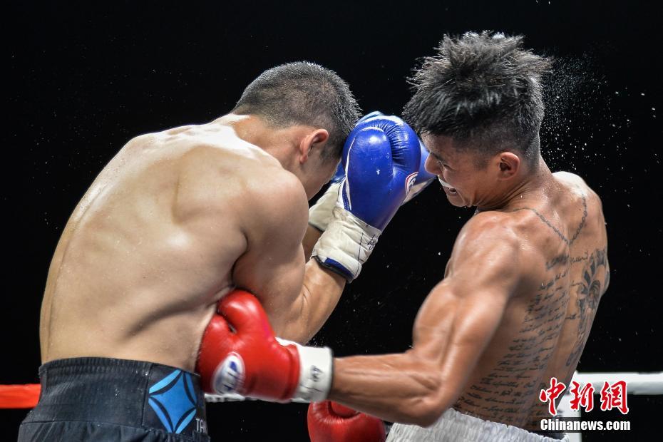 2月16日晚,2019“博海争霸”国际职业拳王争霸赛在海口开打,来自中国大陆、台湾、澳门和泰国、土耳其、印度的14名选手在海上擂台PK,争夺CBCU/IBO金腰带、国际排名积分。图为中国台湾选手宋维杰(右)力克中国澳门选手周志轩。洪坚鹏 摄