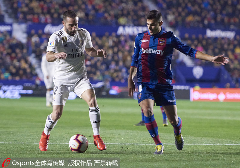 人民网北京2月25日电 北京时间2月25日03:45(西班牙当地时间24日20:45),2018/19赛季西甲第25轮一场焦点战在瓦伦西亚市政球场展开争夺,莱万特主场迎战皇家马德里。本泽马和贝尔先后罚入点球,马尔蒂进球,纳乔和罗奇纳终场前被罚下,最终皇马2-1战胜对手,夺得客场4连胜。
