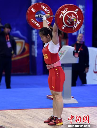 图为2月25日晚,邓薇在女子64公斤级比赛中。当日,2019年举重世界杯赛暨2020年东京奥运会资格赛在福州进入第三个比赛日。在女子64公斤级决赛中,中国选手、奥运冠军邓薇最终以抓举113公斤、挺举141公斤、总成绩254公斤的优异成绩包揽该级别三枚金牌。 张斌 摄