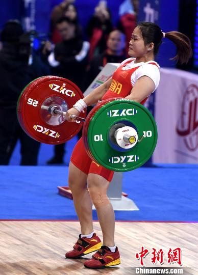 图为2月25日晚,邓薇在女子64公斤级比赛中。当日,2019年举重世界杯赛暨2020年东京奥运会资格赛在福州进入第三个比赛日。在女子64公斤级决赛中,中国选手、奥运冠军邓薇最终以抓举113公斤、挺举141公斤、总成绩254公斤的优异成绩包揽该级别三枚金牌。 张斌 摄