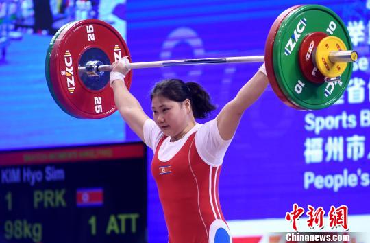 图为2月25日晚,朝鲜选手金孝珍在女子64公斤级比赛中。在该级别决赛中,朝鲜的金孝珍以抓举106公斤、挺举126公斤、总成绩232公斤获得三枚铜牌。当日,2019年举重世界杯赛暨2020年东京奥运会资格赛在福州进入第三个比赛日。 张斌 摄