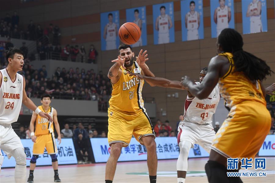 浙江广厦控股队球员博洛西斯(中)在比赛中传球。新华社记者黄宗治摄