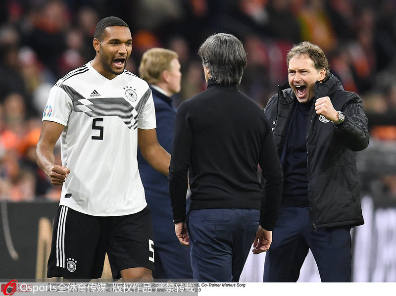 人民网北京3月25日电(杨磊) 北京时间3月25日凌晨,欧洲杯预选赛C组小组赛继续进行,德国客场3比2力擒荷兰。上半时,舒尔茨助攻萨内首开纪录,格纳布里扩大比分。下半时,19岁中卫德利赫特顶进国家队处子球,德佩1传1射。第90分钟,刚出场的罗伊斯助攻舒尔茨绝杀。