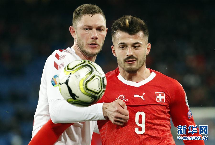 3月26日,瑞士队球员阿耶蒂(右)与丹麦队球员达尔斯加德在比赛中争抢。 当日,在瑞士巴塞尔举行的2020年欧洲足球锦标赛预选赛D组第二轮比赛中,瑞士队主场以3比3战平丹麦队。 新华社发(鲁本·斯布里奇摄)