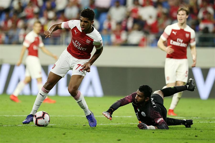 3月26日,阿森纳队球员朱尔斯(左)在比赛中拼抢。 当日,在阿联酋迪拜进行的一场足球热身赛中,阿森纳队以3比2战胜迪拜胜利队。 新华社发(马哈茂德·哈立德摄)