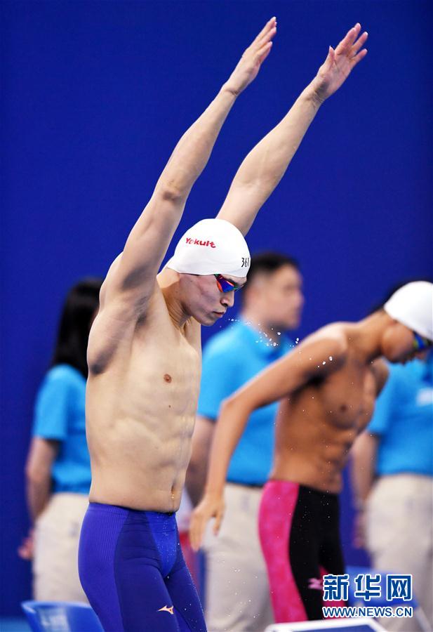 浙江队选手孙杨在比赛开始前。 当日,在青岛举行的2019年全国游泳冠军赛暨世锦赛选拔赛男子800米自由泳决赛中,浙江队选手孙杨以7分48秒03的成绩获得冠军。